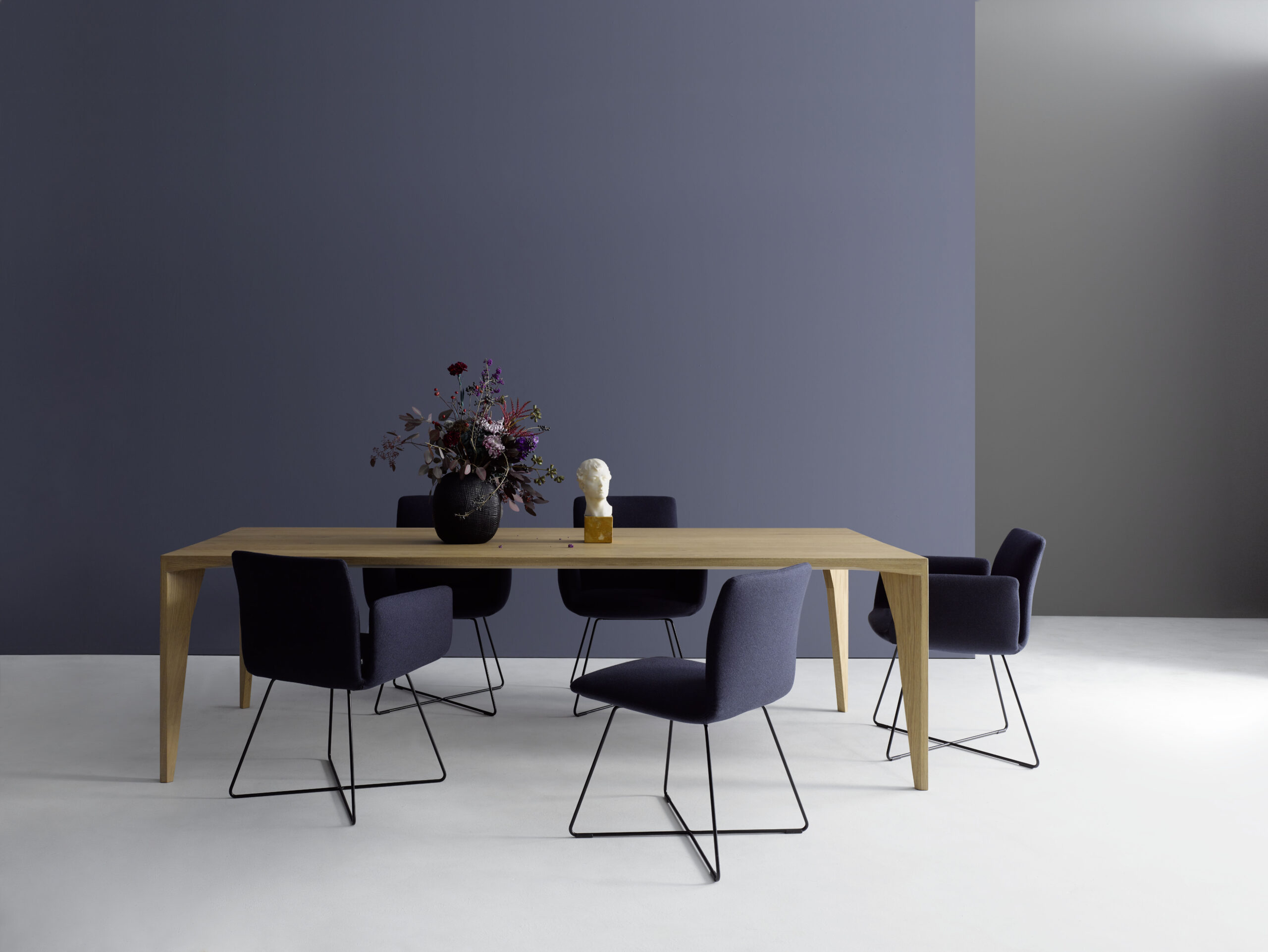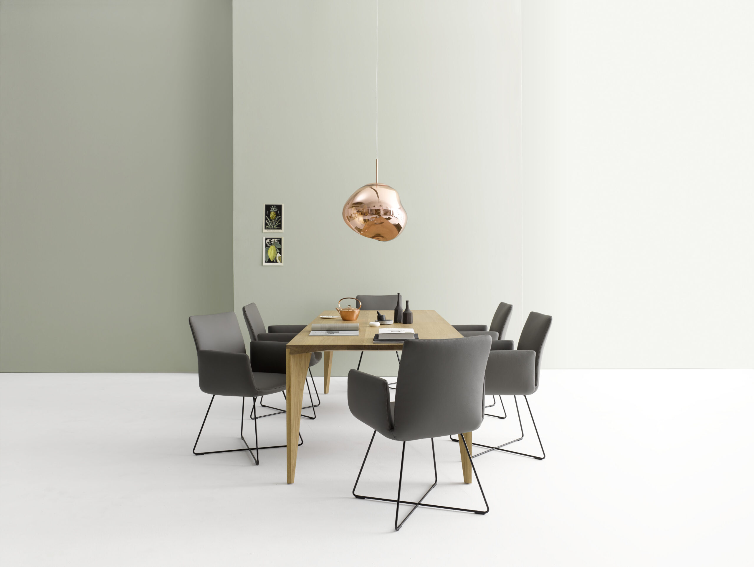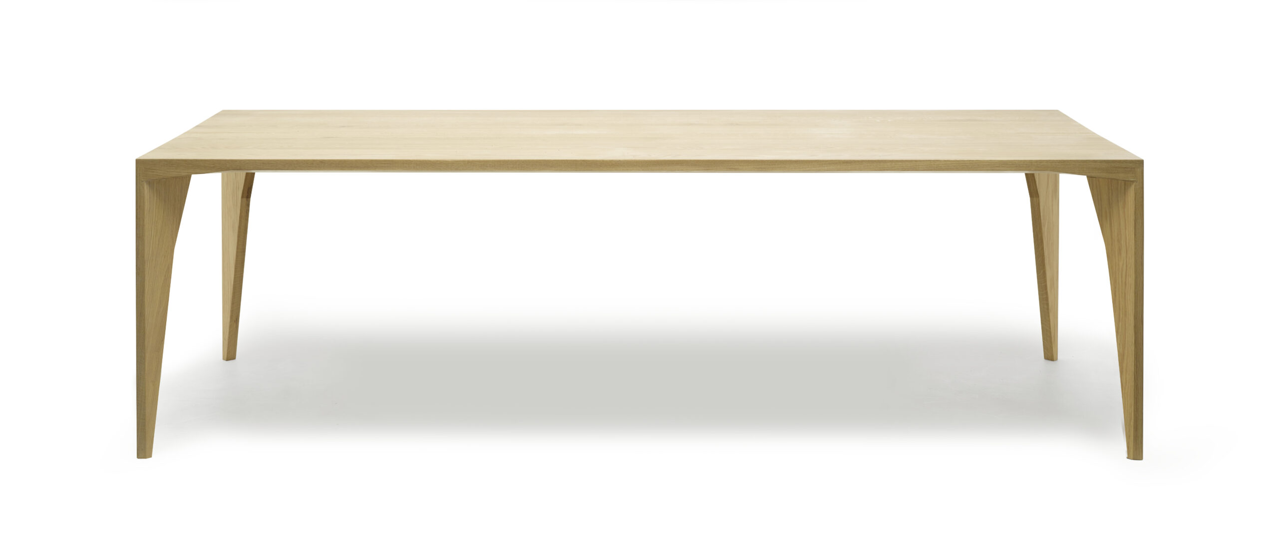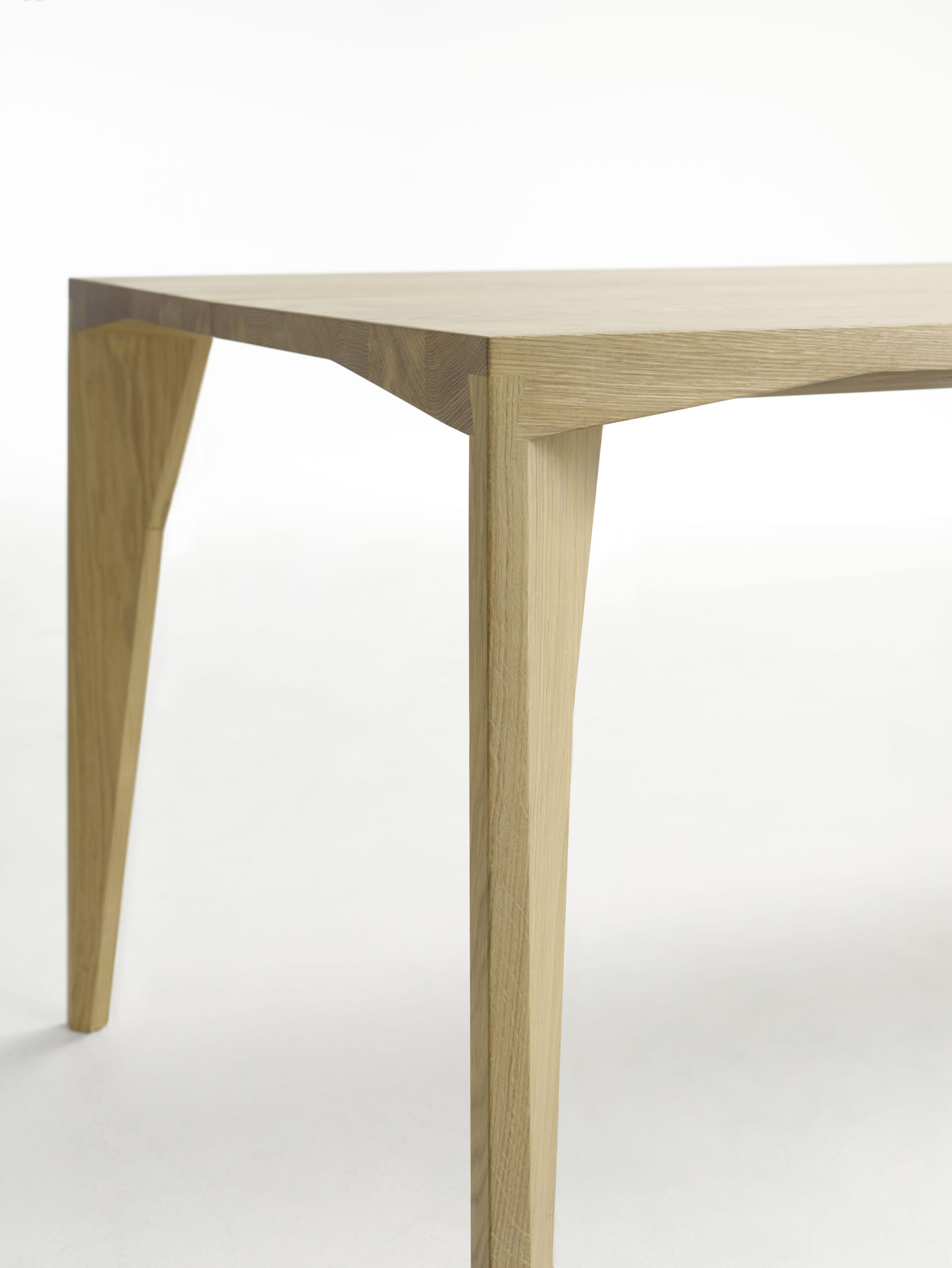 Der Massivholztisch ist durch eine funktional gedachte, handwerklich ausgeführte und gestalterisch ablesbare Eckverbindung gekennzeichnet.