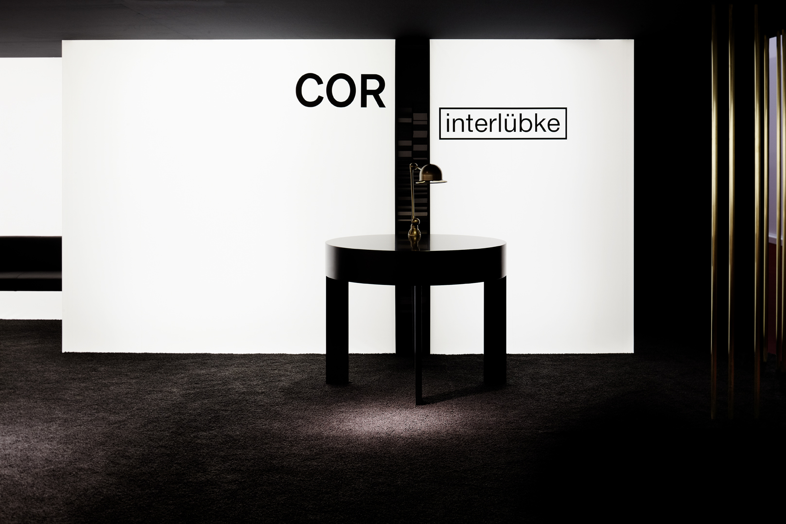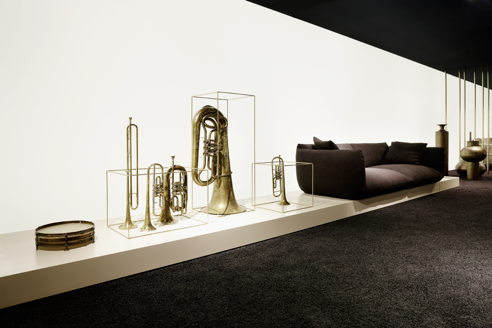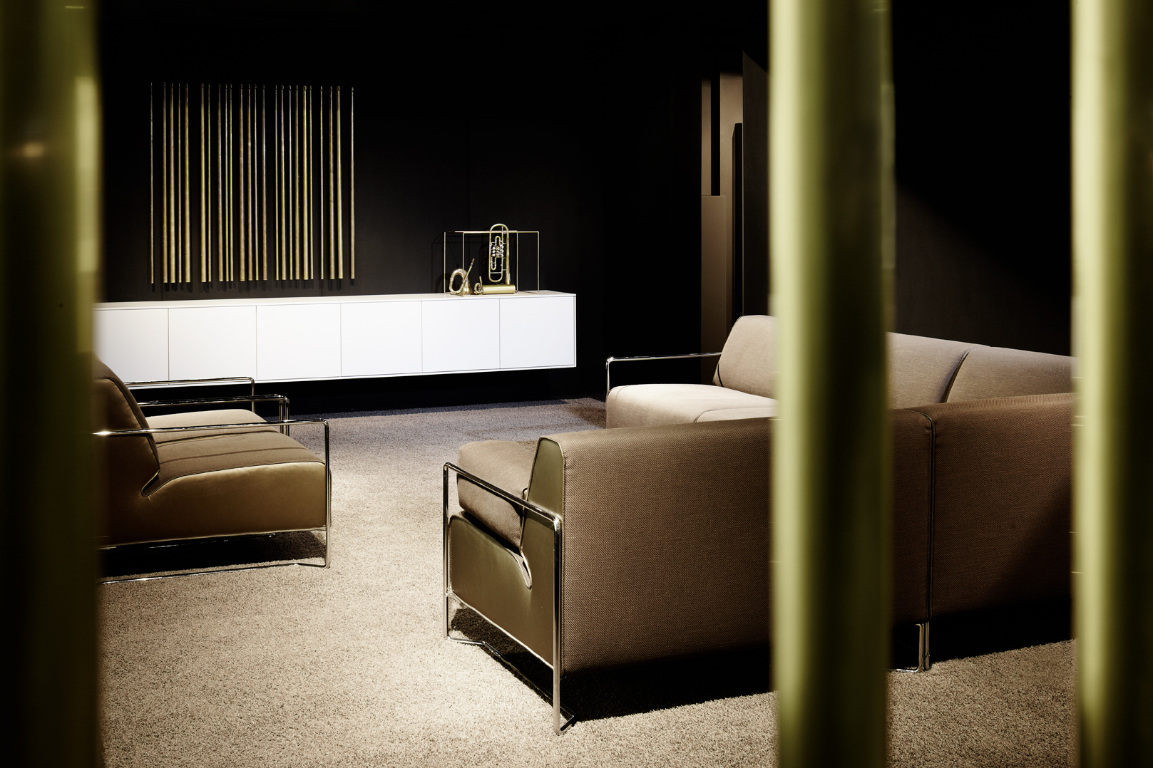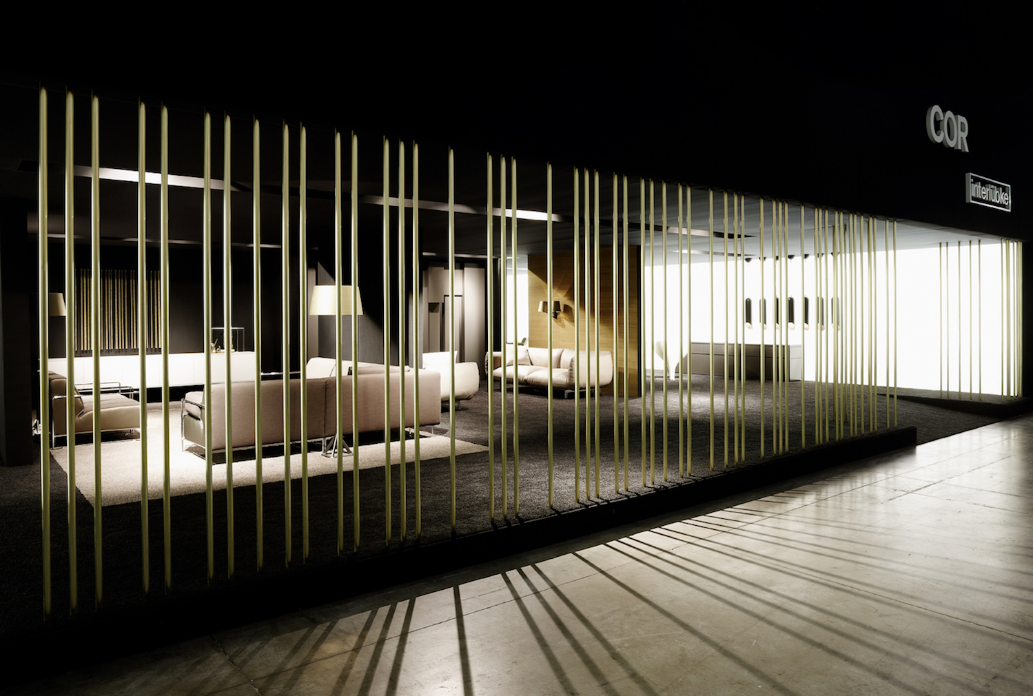 Der gemeinsame Messestand präsentiert die Möbel beider Hersteller in warmen Farbtönen und möglichst wohnlicher Atmosphäre. Dies wird unter anderem durch eine relativ geringe Deckenhöhe unterstützt. Großzügigkeit und Weitläufigkeit werden durch die seitlich angeordneten Lichtwände erzeugt. Die Eingangsfassaden besteht aus senkrecht angeordneten Messingrohren. Dieses Material zieht sich mit der Dekoration durch den gesamten Stand.