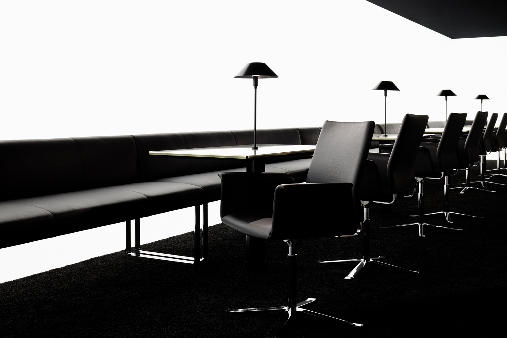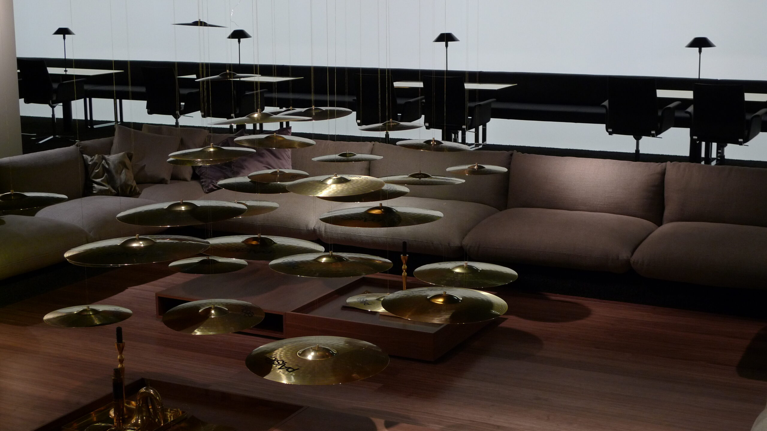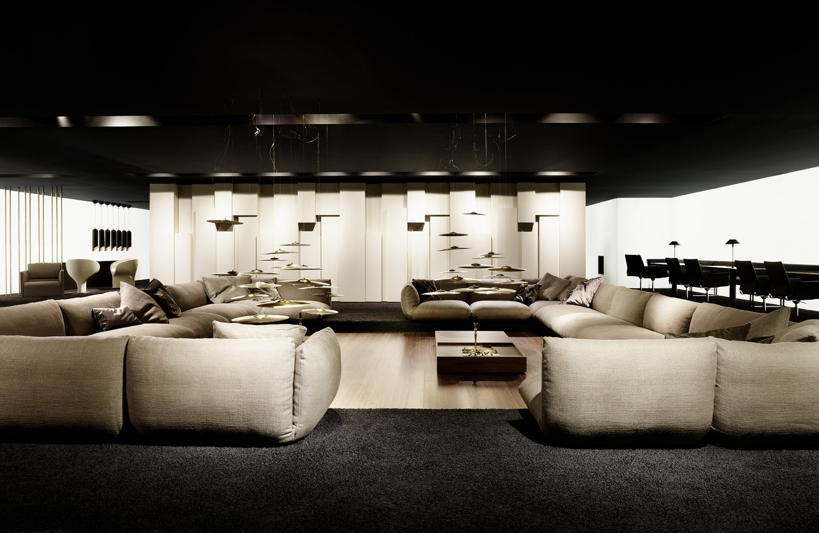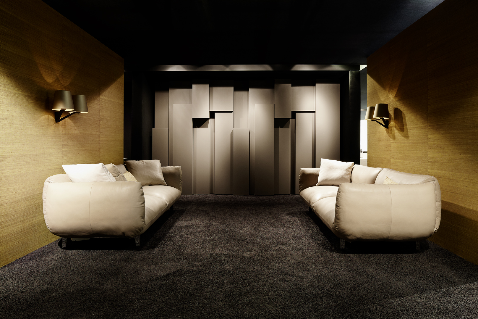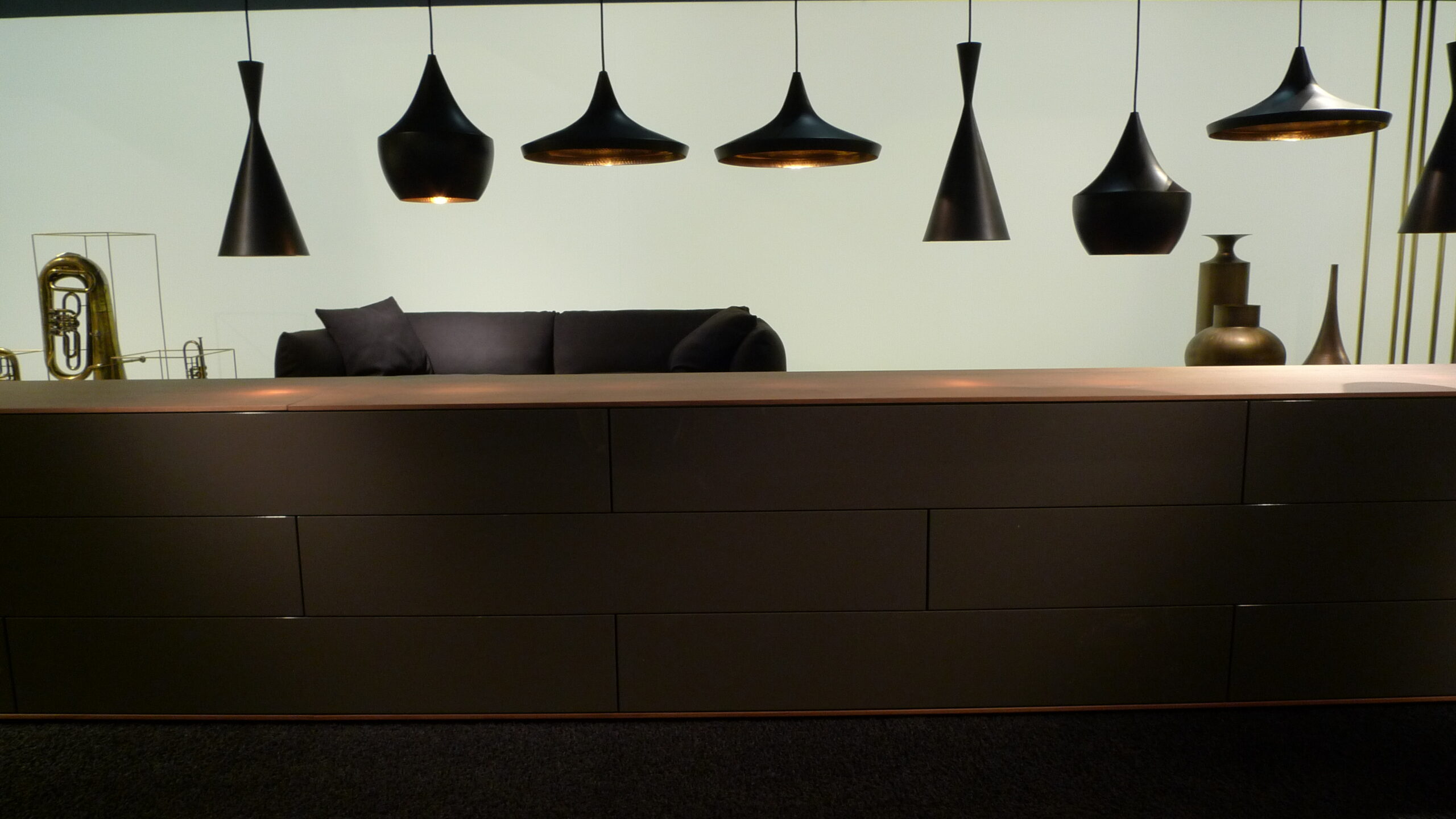 Der gemeinsame Messestand präsentiert die Möbel beider Hersteller in warmen Farbtönen und möglichst wohnlicher Atmosphäre. Dies wird unter anderem durch eine relativ geringe Deckenhöhe unterstützt. Großzügigkeit und Weitläufigkeit werden durch die seitlich angeordneten Lichtwände erzeugt. Die Eingangsfassaden besteht aus senkrecht angeordneten Messingrohren. Dieses Material zieht sich mit der Dekoration durch den gesamten Stand.