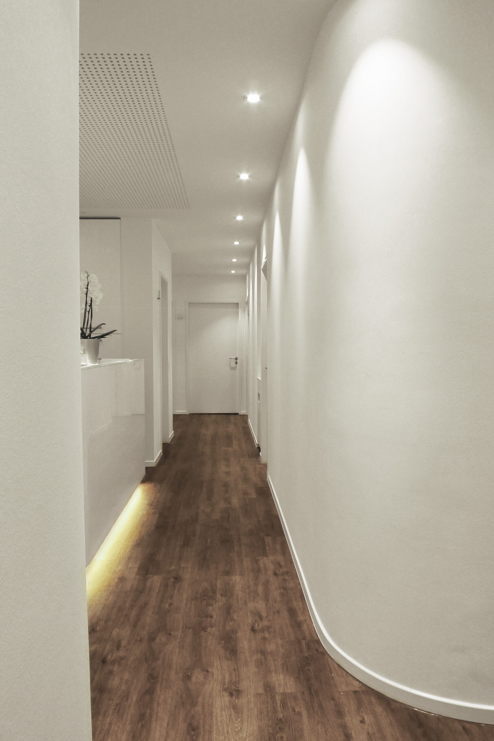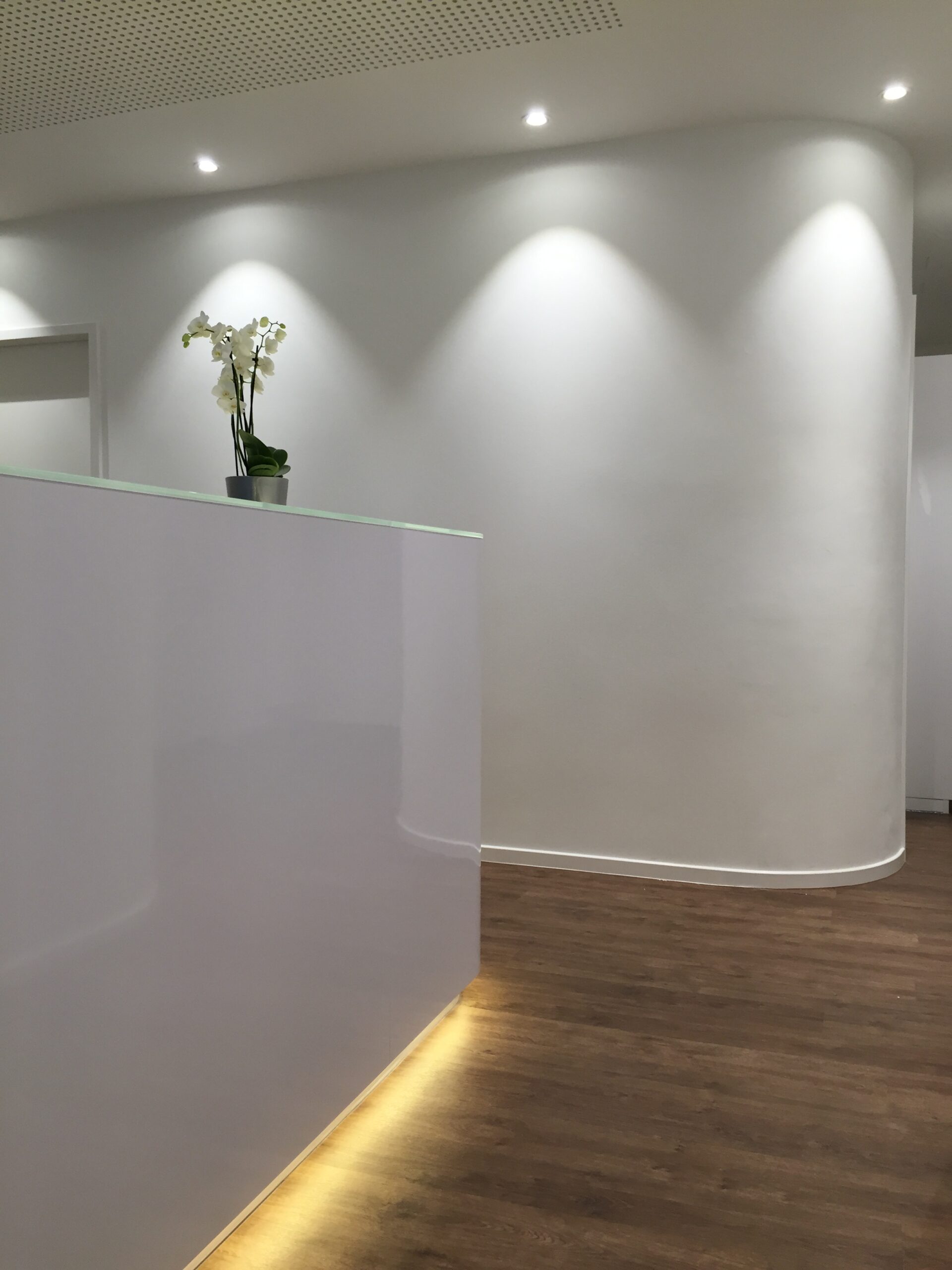 Im Eingangsbereich mit Zugang zum Kosmetikraum, gibt es einen kleinen Wartebereich mit Bank. Geleitet durch zwei gebogene Wände gelangt man zur Rezeption. Diese ist durch eine Glaswand vom Wartebereich getrennt. Im hinteren Bereich der Praxis sind die Behandlungsräume angeordnet.